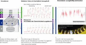 Die Messstelle auf Höhe des Prozesses zeigt deutliche Reaktionen auf den Verschleiß. Im nebenstehenden Bild ist das in den Kraftverläufen (mitte/unten) dargestellt. Die Maschinen-Kraftsensorik ist gegenüber den Änderungen am Werkzeug weit weniger sensibel (mitte/oben). Für den Aufbau von predictive-maintenance Prozessen wurde für jedes Bauteil im Rahmen von Edgecomputing ein Kennwert gebildet. Die entsprechende Punktewolke ist in dem Graphen rechts oben dargestellt. Der Maximalwertverlauf des Kennwerts signifikant eingebrochen, bevor es zu Toleranzproblemen an den Produktionsergebnissen kam. Die erfassten Daten können also in Systemen der künstlichen Intelligenz oder mit Schwellenwertverfahren weiterverarbeitet werden um Entscheidungen in Form von Predictive Maintenance zu unterstützen oder automatisiert zu treffen.
