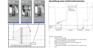 In Zusammenarbeit mit einem Maschinenhersteller wurde eine Fertigungsanlage für die Umsetzung von predictive maintenance Funktionalitäten erweitert. Bei dem Prozess werden axiale Nebenformen auf Hohl- oder Vollwellen erzeugt, wobei das Bauteil in mehreren rekursive Vorschubbewegungen umgeformt wird. Markante Prozessphasen und ein typischer Kraftverlauf sind in der Abbildung rechts dargestellt.